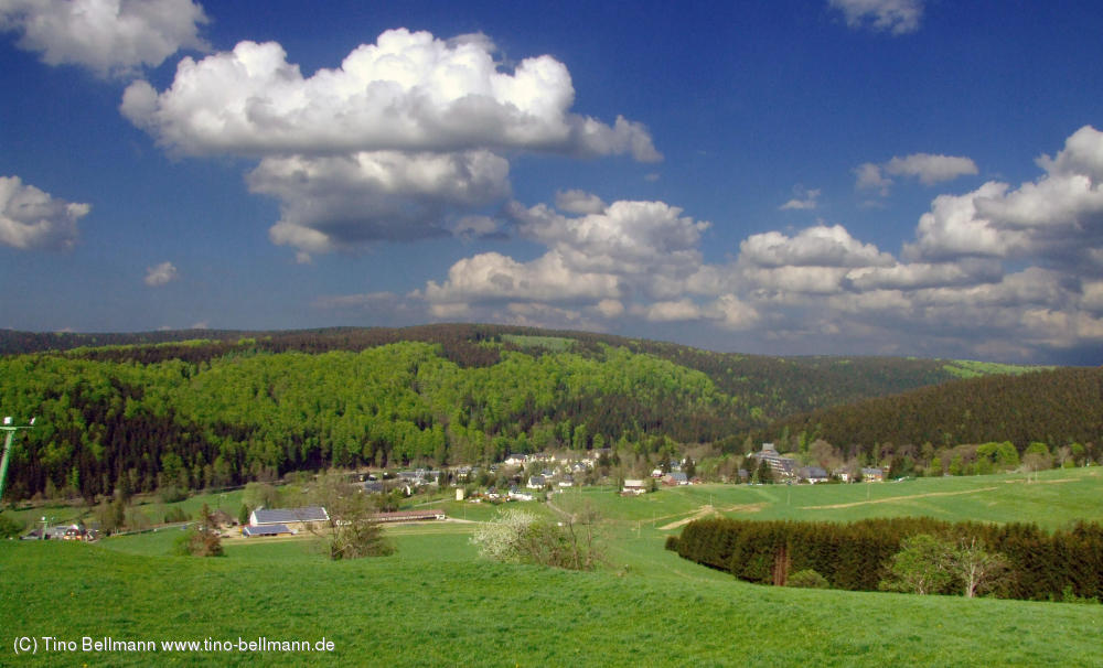 Holzhau am 4.5.2012Nach dem harten Winter treiben nun die Buchen am "N-Berg". In der Bildmitte der 805 m hohe "Drachenkopf" (04.05.2012) |