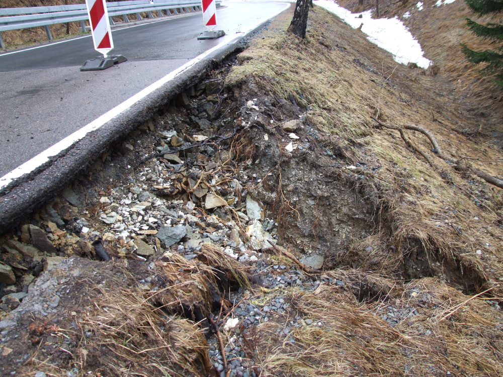 Nach der Schneeschmelze in Holzhau, Nähe "Teichhaus"In der Nähe des "Waldgasthofes Teichhaus" ist die Straße ausgespült und nur einspurig befahrbar. Erst vor einem Jahr wurde hier gebaut.