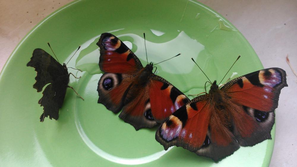 Tagpfauenaugen beim Honig naschen :-DDrei Schmetterlinge haben sich in mein Büro verflogen - Es gibt einen Teller mit ein paar Tropfen verdünntem Honig (21.01.2015) |